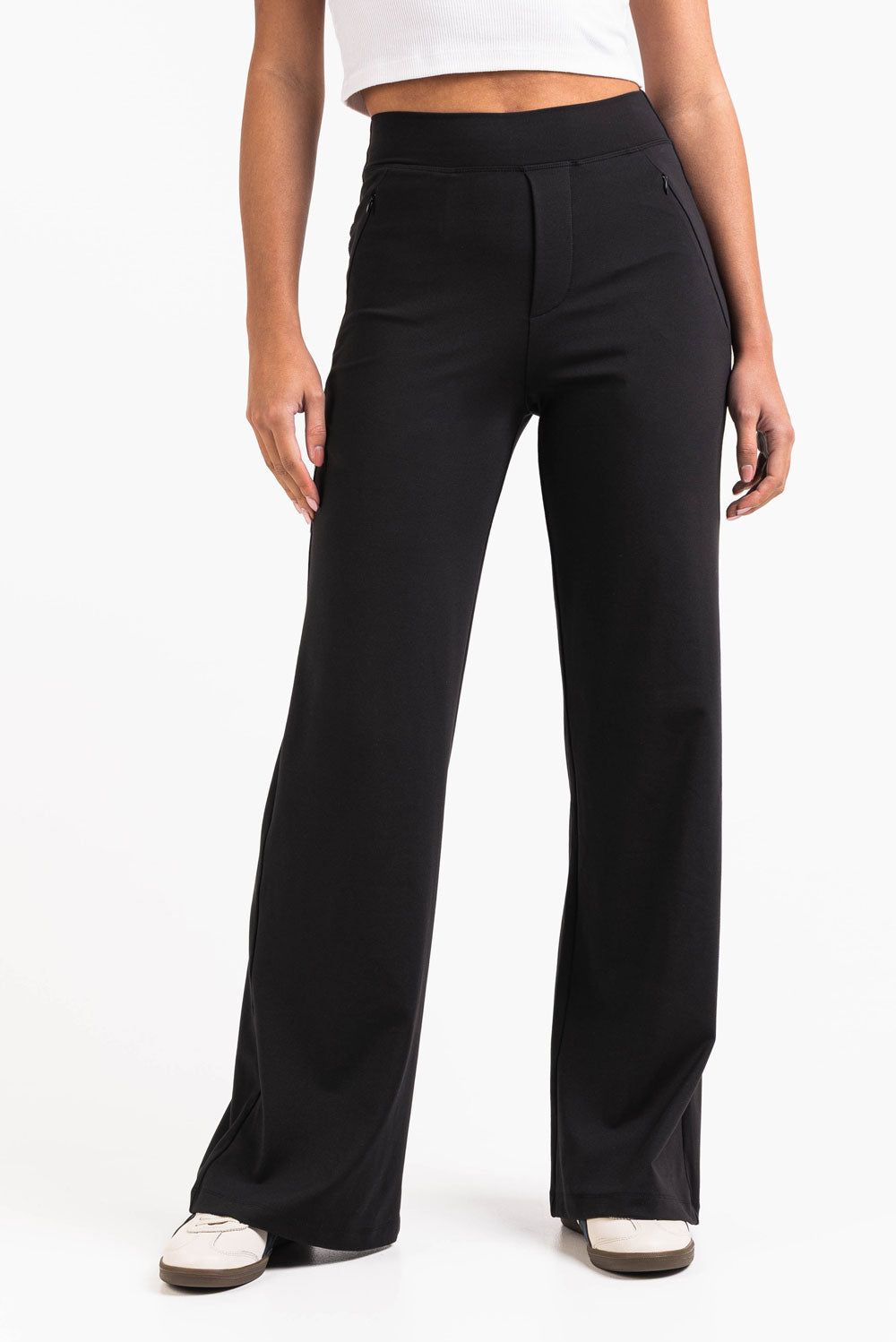 Disse høytlivsbuksene har vide ben med praktiske sidelommer. Elastisk midje og falsk glidelås gir komfort, noe som gjør dem til et allsidig og lettbært alternativ for hverdagsbruk.
