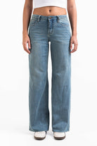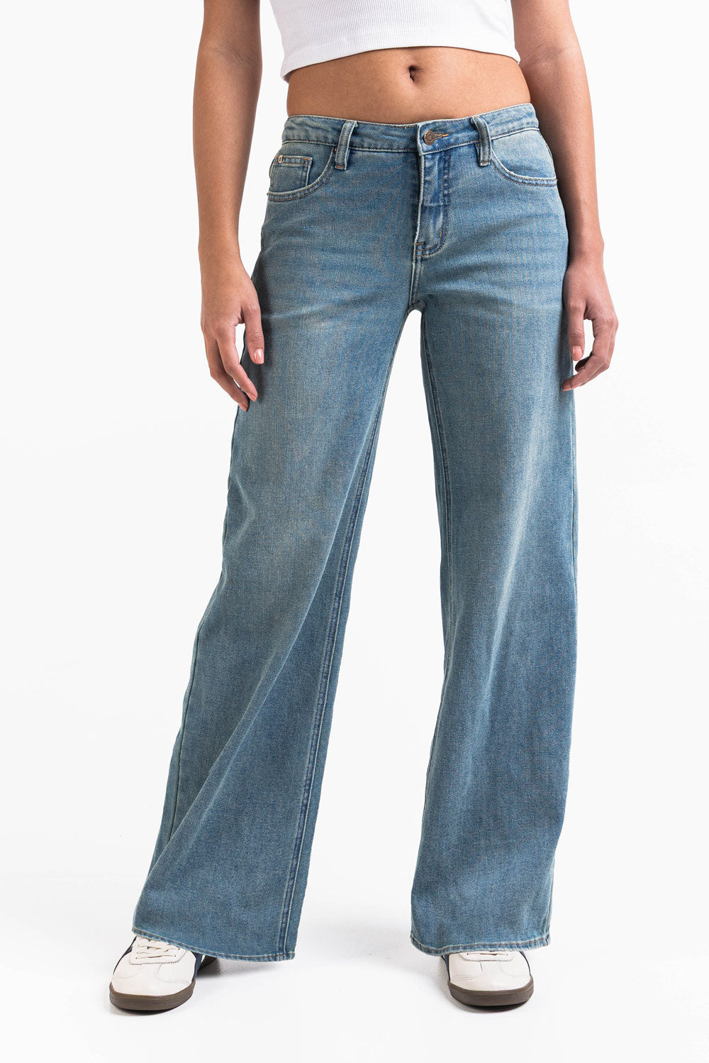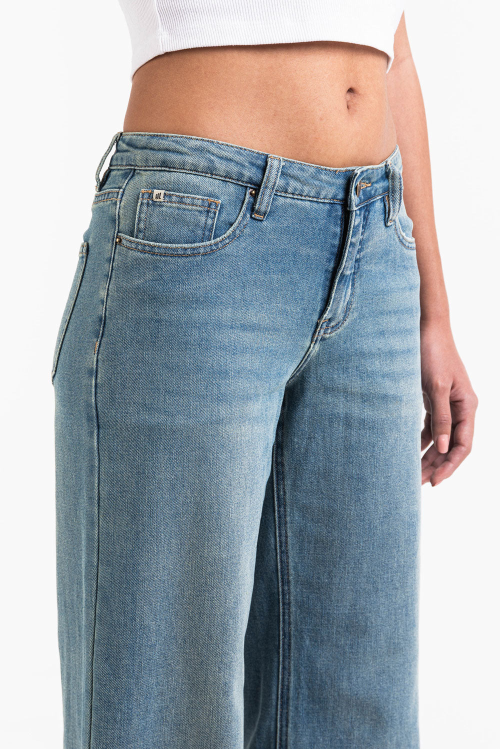 Mid waist-jeans med vide ben og lommer foran og bak. Beltehemper som passer både smalere og bredere belter. Buksen lukkes med glidelås og knapp.
