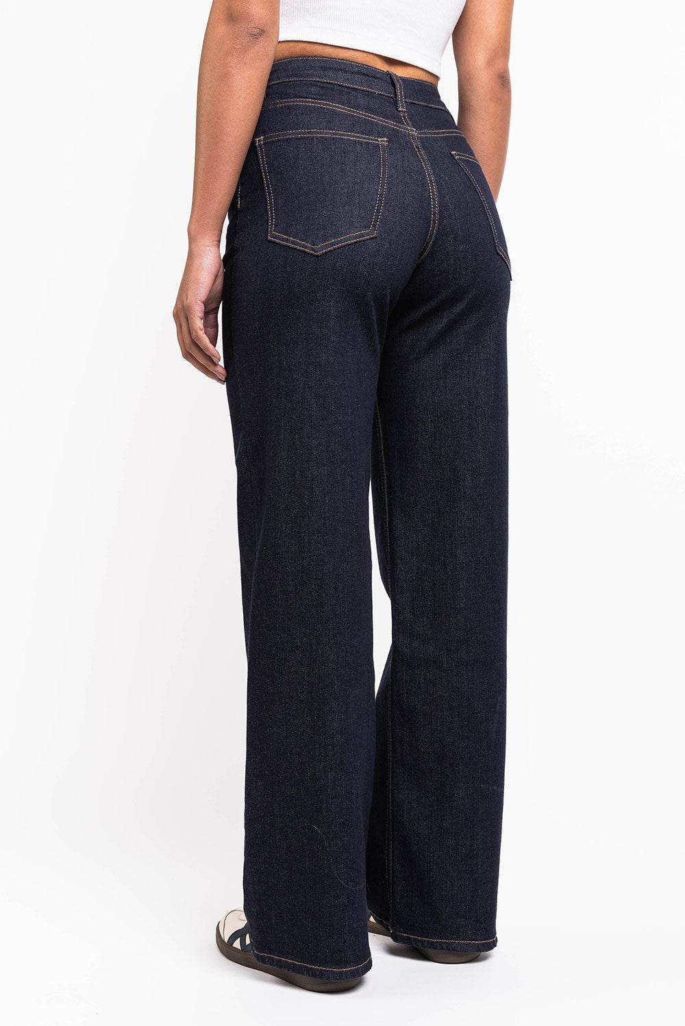 Mid waist-jeans med vide ben og lommer både foran og bak. Beltehemper som passer til både smale og brede belter. Buksen lukkes med glidelås og knapp.